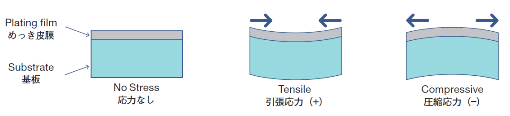 応力とは何らかの要因で物体内部に発生した単位面積に働く力のことをいい、めっき皮膜にはどうしても内部応力が生じます。一般に応力には「圧縮応力」と「引張応力」があります。皮膜面が凹となり物体を拡張する方向の力を「引張応力」、皮膜面が凸となり物体を縮小する方向の力を「圧縮応力」といいます。