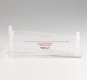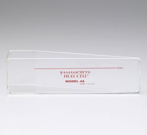 ハルセルロングタイプとはハルセル水槽の種類の一つで、従来のハルセル水槽よりも長い台形型水槽を利用し連続した広範囲な電流密度での析出状態を観察する事を可能にします。液量は約430mlで、基本的な評価の方法は通常のハルセルと同様です。ハルセルの試験方法についてはこちらをご参照ください。