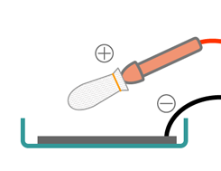 まず、電源のスイッチを入れ適正電流値に設定し、筆具を電解脱脂液に浸した後、めっきしたい部分に筆具を当てます。 すると電気が流れ、表面の汚れが落ちます。ある程度脱脂を行いましたら、水洗し汚れを流してください。 水洗後、活性化も同じように行い、再度水洗します。
